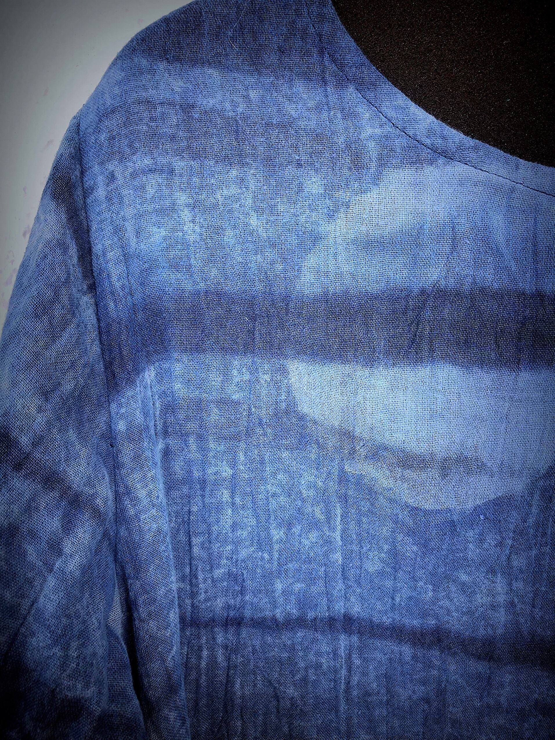 気持ちのよいダブルガーゼ生地です。天然の藍染めをしたものです。まるで夜空に月が浮かんでいるようなデザインですね。
