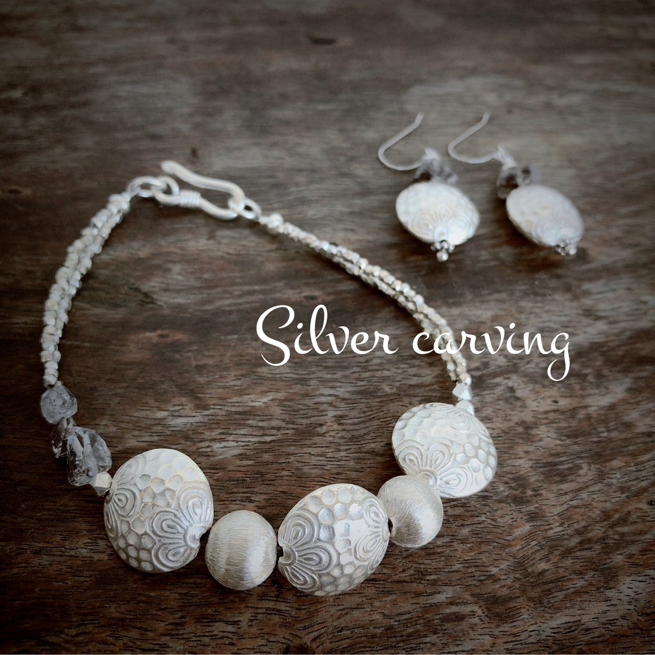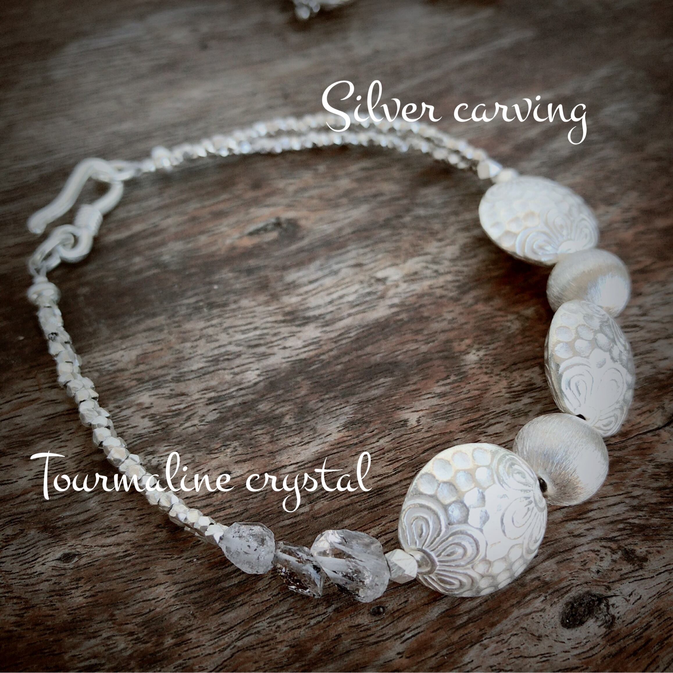 花のカービングパーツ、天然石はトルマリンクォーツを挟みました。